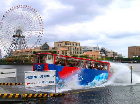 You can enjoy good scenery of Yokohama Bay Area from both of land and sea.A splash when the bus enter the water is dynamic!!
