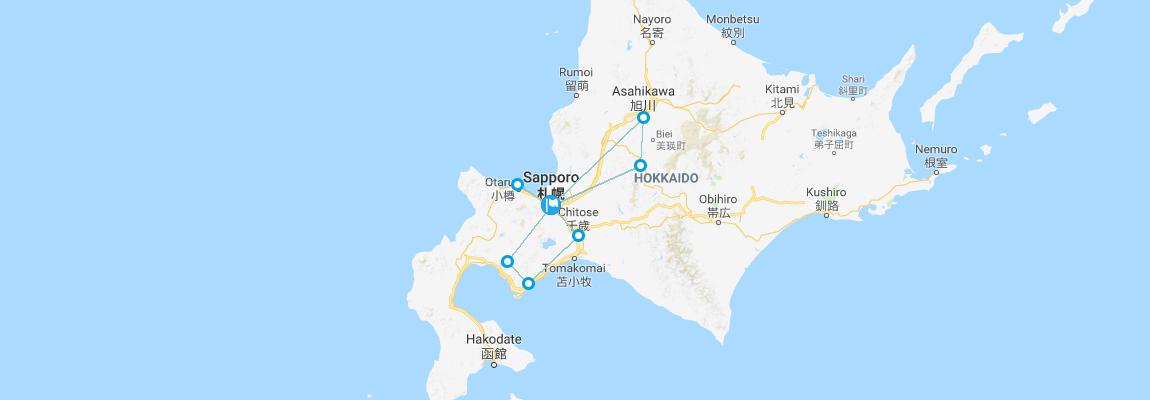 Tour Route: Sapporo - Otaru - Sapporo - Asahikawa - Furano - Sapporo - Chitose - Noboribetsu - Lake Toya - Sapporo