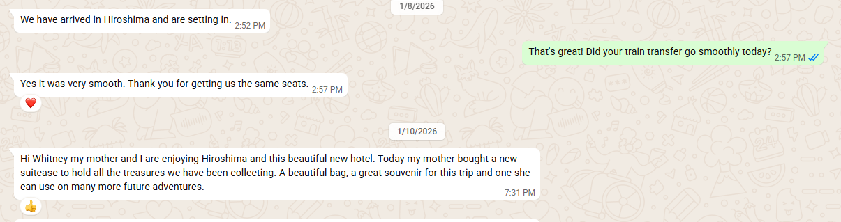 | Any Other Aspect | Overall trip experience is good except for Takachiho boating reservations could have been better handled with staffs' close monitoring of the online bookings since it's a known fact that it's "difficult" to obtain boat tickets. Just wondered how did other agents managed to get their tickets for customers?Really a great disappointment for the whole group not being able to ride/ row the boat! | ||