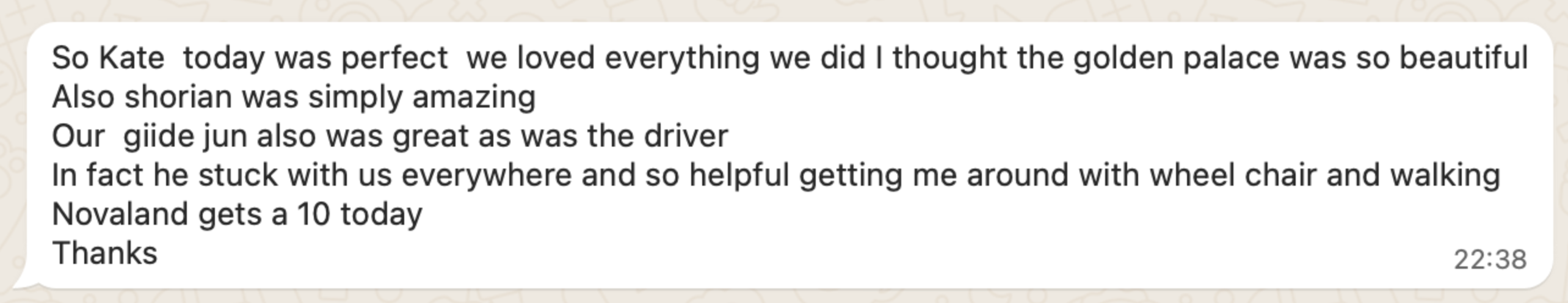 I also want to mention Melody responsiveness by e-mail and WhatsApp for real-time changes, validation that we are Ok and proceeding well. And finally had some positive surprises from Novaland (good meal during the trip, small presents from guides). BTW, some attractions that we decided to skip - we got immediate refund (when the location was either refundable or payment had to be made during entrance.)
