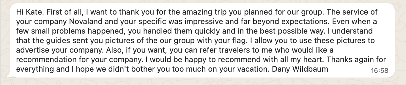 Novaland Tours is an amazing tour agency. This agency is great regarding professionalism, planning, price, trustworthy, best options, great administrators personnel, and the tour guides are the simply best.