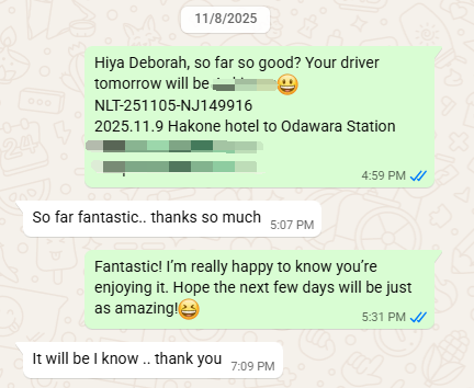 | Motoki Watanabe Tokyo,Hakone Nov 16 - 18, 2025 | Command of English: 5 Knowledge of Subjects: 5 Ability of Explain: 5 Attitude: 5 Flexibility: 5 | Without a doubt, Motoki is the best tour guide I have ever had. | |