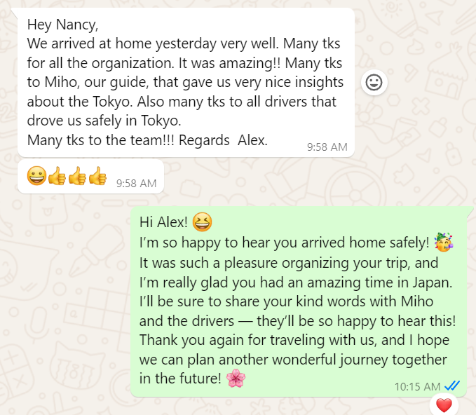 The only area that could’ve been better was the hotel in Tokyo. It was OK at best. The breakfast was disappointing compared to the other hotels we stayed in. Thanks.